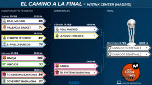 Este sábado se disputarán las semifinales. A las 16.00 horas, el Real Madrid se mide al Lenovo Tenerfie. Después, 19.00 h, Barcelona y TD Systems Baskonia reeditarán lo que fue la final de la Fase Final Excepcional que dio el título a los vitorianos.