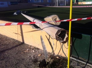 Sant Jordi; Una de las torres de iluminación del campo de fútbol de Can Guerxo se viene abajo sin causar heridos