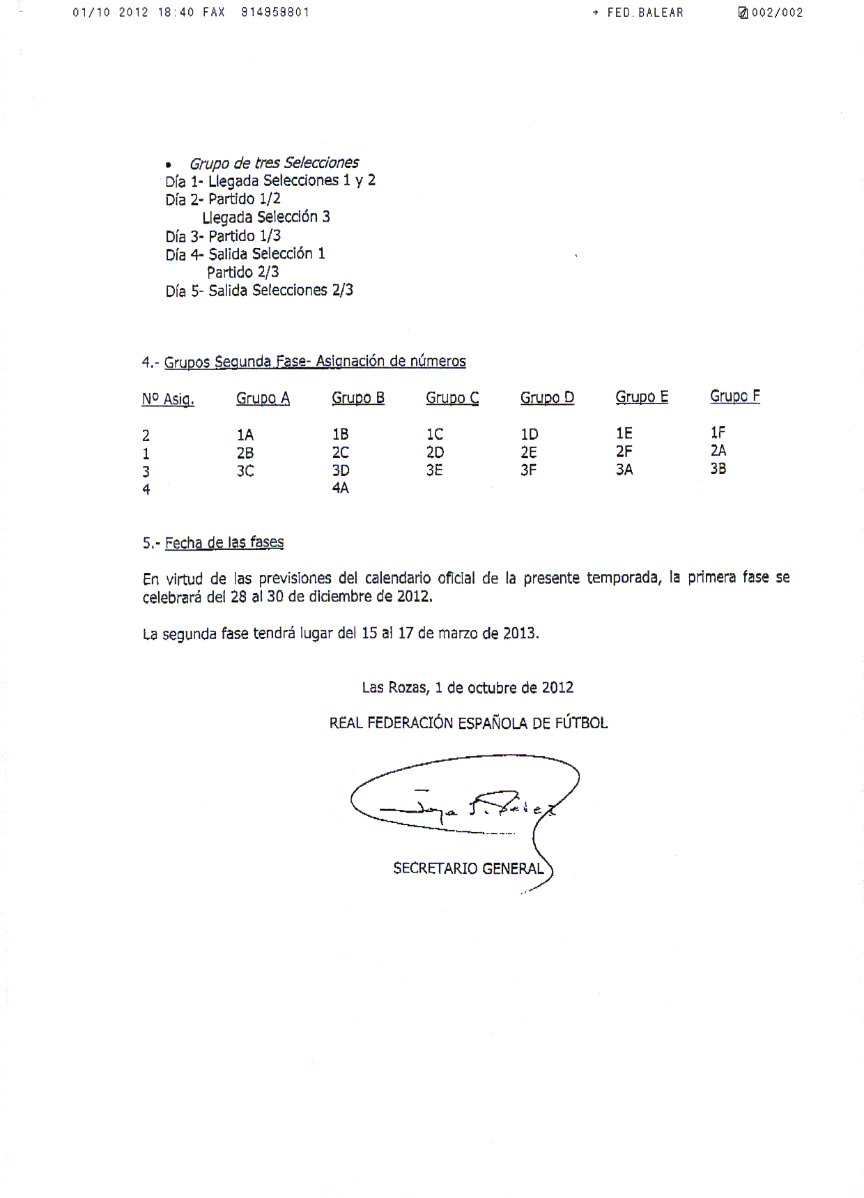 Melillense Ceuta Resto de sedes y configuración de grupos: Grupo A 2A: Andaluza 3A: Canaria 4A: Asturias Grupo B Sede: Valencia 2B: Comunidad Valenciana 3B: Cántabra Grupo C 2C: Castilla y León 3C: Extremeña Grupo D 2D: Navarra 3D: Riojana Grupo F 1F: Aragonesa 2F: Gallega 3F: Castilla La Mancha Plan de Competición, Primera y Segunda Fase Grupo de cuatro selecciones DÃa 1: Llegada de selecciones DÃa 2: Partidos 4/3 y 2/1 DÃa 3: Partidos 3/2 y 1/4 DÃa 4: Salida selecciones Grupo de tres selecciones DÃa 1: Llegada de selecciones 1 y 2 DÃa 2: Partido 1/2 y llegada selección 3 DÃa 3: Partido 1/3 DÃa 4: Salida selección 1 y partido 2/3 DÃa 5. Salida selecciones 2/3 La primera fase se celebrará del 28 al 30 de diciembre de 2012 y la segunda fase del 15 al 17 de marzo de 2013 |