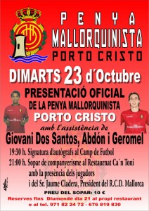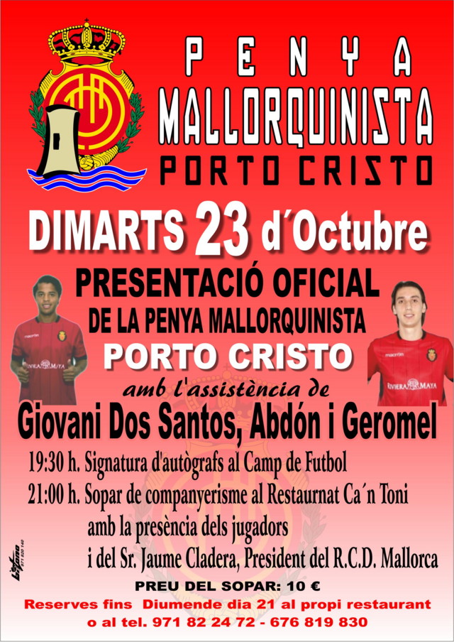 La peña mallorquinista de Porto Cristo celebra este martes su fiesta de inauguración. A las 19:30h en el Camp Munipal d´Esports de Porto Cristo todos los niños porteños podrán estar junto a sus ídolos, fotografiarse y recibir merchadising del club firmado por sus ídolos y a partir de las 21h tendrá lugar la cena en el Restaurant Ca´n Toni de Porto Cristo. Se trata de una peña de reciente creación que ha contado con una gran acogida ya que ha tenido desde el primer momento un gran éxito de captación de socios, losimpulsores de la Penya son Toni Lluis i Llorenç Barceló.