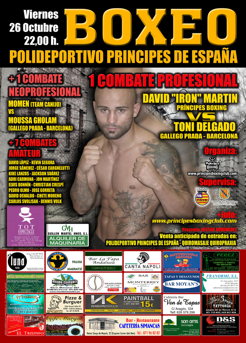 El Príncipes Boxing Club organiza en Palma de Mallorca el próximo viernes 26 de octubre una interesante velada en la que se disputarán un total de 9 combates. Encabezando el cartel, en categoría profesional, destaca la presencia del nuevo prospecto del boxeo balear David ” Iron” Martín qué hará su primer combate en el boxeo rentado delante de toda su afición. Su rival será el catalán Toni Delgado.En categoría neoprofesional el púgil local Momen Mahdaj se enfrentará a Moussa Gholam, del equipo Gallego Prada de Barcelona.