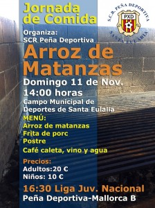 Este domingo Arroz de Matanzas en el Campo Municipal de Deportes de Santa Eulalia. Comida a las 14:00 horas, y a las 16:30 Partido de Liga Nacional Juvenil Peña Deportiva – Mallorca B ¡Te esperamos!