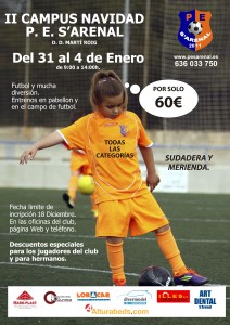 La Penya Esportiva S’Arenal os informa que ya tiene abierto el plazo de inscripcion para su II campus de navidad en el campo de futbol del Arenal, los dias 31/12 y 2,3,4/01 de 09:00 a 14:00 donde podreis encontrar buen futbol y mucha diversion, con entrenos en pabellon en campo y concursos de play station, ping-pong etc…. Entra la merienda y una sudadera para los participantes, descuentos especiales para hermanos, no dudeis en informaros en las oficinas del club, en el telefono 636033750 o en la paguina web www.pesarenal.es, apuntate antes del 18/12 plazas limitadas.