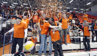 No podrán serlo los sorianos, tras caer contra el Unicaja Almería, sin duda, el invitado a esta fiesta con la afición más singular. Para constatar la rareza de la hinchada solo es necesario acercarse a la quincena de personas –las hay de todas las edades– que, armadas con pitos, camisetas blanquiverdes y animados pompones, animan con desenfreno al equipo de Piero Molducci. Escuchar conversaciones en marcado catalán de Mallorca y dibujar un interrogante en el rostro es todo uno.