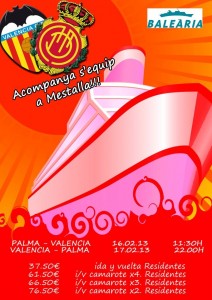 La Grada Jove hace un llamamiento a la afición para acompañar al RCD Mallorca a Valencia el próximo 17 de febrero. Balearia saca unos precios de guerrilla para animar a todos los socios y aficionados a dar el empujón que le falta al equipo.