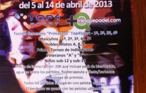 El próximo mes de abril en las instalaciones del gimnasio Top 4 Sport se llevará a cabo el Primer Torneo Primavera en que habrá cinco categorías femeninas, cuatro masculinas y tres en dobles mixto.