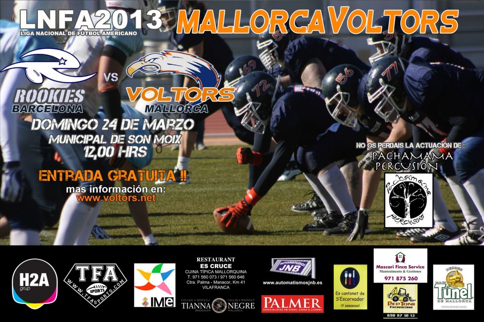 Os invitamos a tod@s nuestros amigos a disfrutar de la VI Jornada de la LNFA donde los Mallorca Voltors se enfrentarán a los Rookies de Barberá, el próximo domingo 24 de Marzo a las 12.00 horas en el Polideportivo de Son Moix.