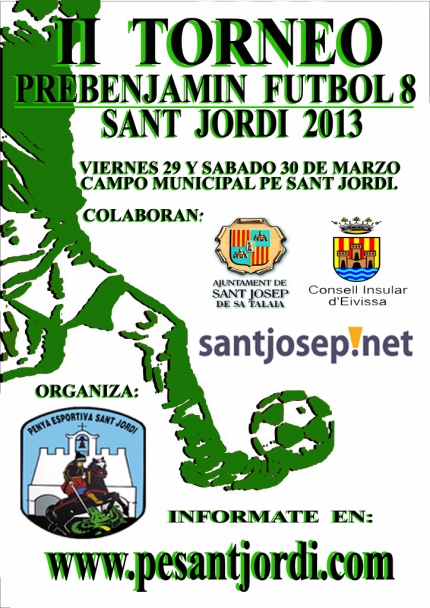 Todo preparado en Sant Jordi para acoger la segunda ediciĂłn del Torneo PrebenjamĂn de FĂștbol 8. La Semana Santa es la mejor Ă©poca para disfrutar de los eventos deportivos y, tras el Ă©xito del torneo la temporada pasada, la Penya Esportiva Sant Jordi ha preparado una nueva y bonita ediciĂłn. El evento se desarrollarĂĄ en el Municipal de Sant Jordi los prĂłximos viernes 29 y sabado 30 de Marzo. Cinco equipos de primer año (Sant Jordi, Peña Deportiva, Portmany, JesĂșs y Atco. Blanc i Blava) y nueve conjuntos de segundo año o mixtos (Sant Jordi, Portmany, Peña Deportiva, Formentera, Rapid Atco., Bahia San AgustĂn, San Rafael, JesĂșs e Insular) disfrutaran de esta jornada lĂșdica, deportiva y educativa. A partir de las 10:00 horas y hasta las 20:00 horas, se podrĂĄ disfrutar del mejor fĂștbol prebenjamin de las islas. Durante todo el evento, el club tiene prevista la instalaciĂłn de barras con refrescos y bocadillos calientes para el disfrute de todos los asistentes. AdemĂĄs, los mĂĄs pequeños podrĂĄn disfrutar de talleres infantiles e hinchables. Ya esta disponible, en agenda de partidos de la web, el calendario completo del torneo. Esta Semana Santa toca…. ÂĄ II TORNEO PREBENJAMIN DE SANT JORDI 2013 !. AdemĂĄs, otros equipos como el AlevĂn AtlĂštic y el BenjamĂn participaran el el Torneo de Santa EulĂ ria, mientras que los chicos del PrebenjamĂn B marchan rumbo a CastellĂłn para disfrutar del 7Âș torneo «Primer toque CastellĂłn Mediterraneo 2013»