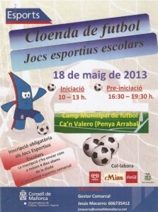 PROGRAMA JOCS ESPORTIUS ESCOLARS 2012-2013 CLOENDA DE FUTBOL Categoria iniciació Data: 18 de Maig de 2013 Lloc: Camp Municipal de futbol Ca’n Valero (Penya Arrabal) Horari: de 10.00 a 13.30 h Categoria: Iniciació Participació: Oberta Participació: 8 equips Cronograma: HORA ACTIVITAT 09.30 Arribada i recepció del participants (zona […]