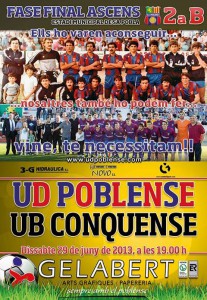 1000378_476512335769345_1869766719_n-207x300Esta tarde se disputará el partido de vuelta entre el Poblense y el Conquense, en el que se espera una muy buena entrada, a pesar de que el partido será retransmitido en directo por IB3 TV