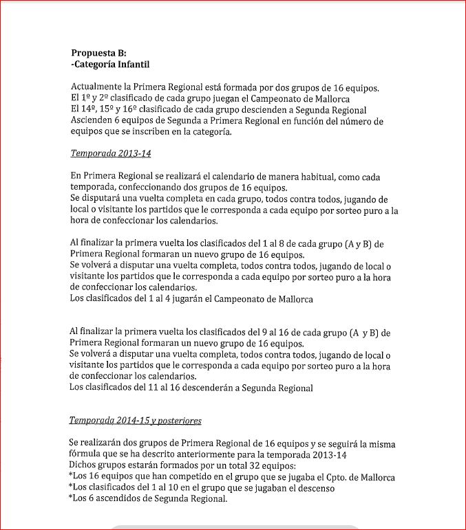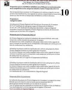 En la Asamblea de la Federación se ha presentado una propuesta para modificar la categorÃa Cadete e Infantil de Primera Regional. En un principio la propuesta fue aprobada por 43 Votos a Favor, 23 Nulos y 30 Votos en contra. Pero dicha votación fue impugnada por el Presidente de un club haciendo referencia a un articulo del Reglamento ya que se incumplirÃa el mismo al modificar los Descensos de estas CategorÃas. Por dicho motivo aunque la Propuesta haya sido aprobada la misma será estudiada el Lunes por los servicios Juridicos de la Federación, si estos dan la razón al club se continuara como hasta ahora en caso contrario se aplicara la modificación de inmediato. (Seguiremos muy atentos a todo lo que ocurra en relación a este tema.)