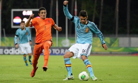 En los minutos finales del primer tiempo, España insistió por el lado izquierdo del ataque con Moi Gómez, José Rodríguez y Sandro Ramírez, entre otros, para inventar alguna jugada que rompiese el orden defensivo holandés, aunque fue en el minuto 36 cuando Clint Leemans anotó el 1-0 para Holanda tras empujar a las mallas un rechace dentro del área española tras un centro desde la banda derecha.