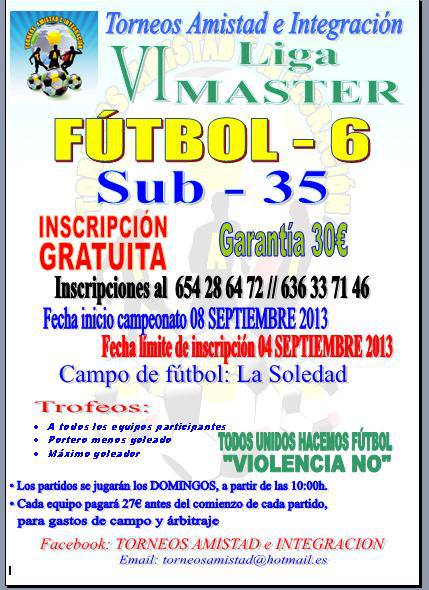 1150877_414938678625399_487900946_nABIERTAS LAS INSCRIPCIONES PARA LA VI – LIGA FUTBOL-6 MSTER / VETERANOS.  CADA EDICION MAS EMOCIONANTE, CON NUEVOS EQUIPOS MAS COMPETITIVOS  NO TE PIERDAS EL TORNEO APERTURA, CLAUSURA Y LA COPA ORO