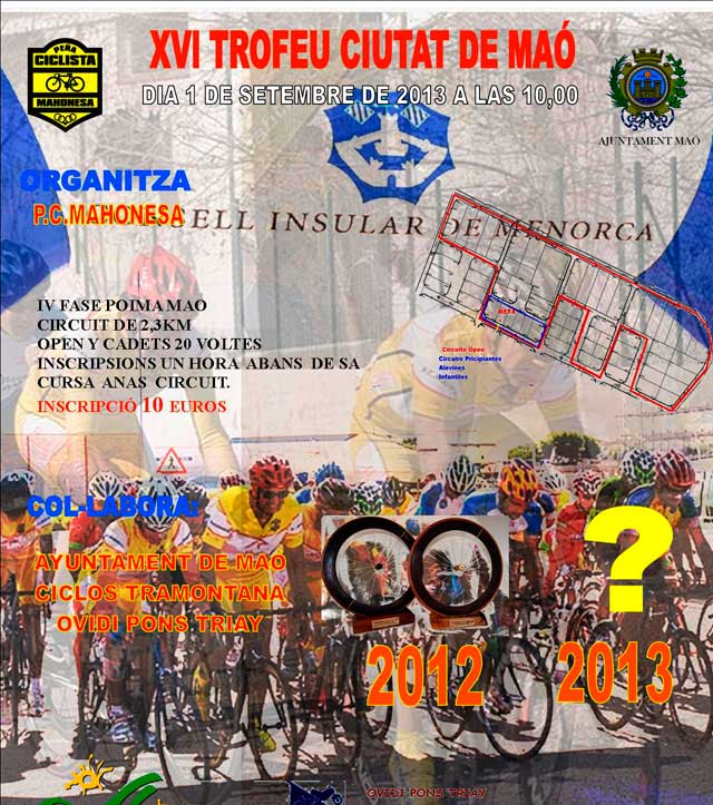 Organizado por la Peña Ciclista de Mahonesa juntamente con el ajuntament de Maó, se ha habilitado un circuito en el poligono industrial de Maó, de 2,3 km. Las categorias Open y Cadetes darán 20 vueltas al circuito. La inscripción es de 10 €. La prueba comenzará a las 10 de la mañana.