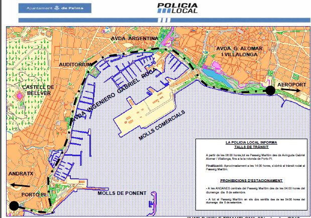 La PolicÃa Local de Palma con motivo de la celebración el próximo domingo dÃa 08 de la Wild Wolf Triathlon Series by Polar, que se disputará por primera vez en el puerto de Palma, se procederá al cierre temporal del Paseo MarÃtimo, desde la avenida Gabriel Alomar, hasta la rotonda de PortopÃ. El cierre tendrá lugar desde la 8 hasta las 14 h.