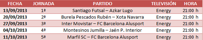 La Liga Regular 13/14 regresará el viernes 13 de septiembre con la primera jornada de Primera División y lo hará por todo lo alto. Energy retransmitirá cada viernes a las 21:00 h el partidazo de la jornada y llevará el mejor espectáculo a todos los hogares de la geografÃa nacional. Ya se han confirmado los cinco primeros partidos televisados de la Liga regular, siendo el primero el derbi gallego entre el Santiago Futsal y el Azkar Lugo.