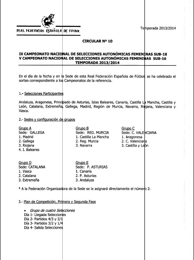 23 septiembre 2013 | Por lorenzo | Categoria: R.F.E.F.En las Instalaciones de la RFEF de las Rozas se llevo acabo el sorteo para la primera fase Femenina de Selecciones Sub-16 y Sub-18, Illes Balears ha quedado encuadrada en el Grupo-A con las siguientes Selecciones MADRID , GALLEGA, RIOJA ILLES BALEARS, , la sede ha sido designada a GALICIAÂ