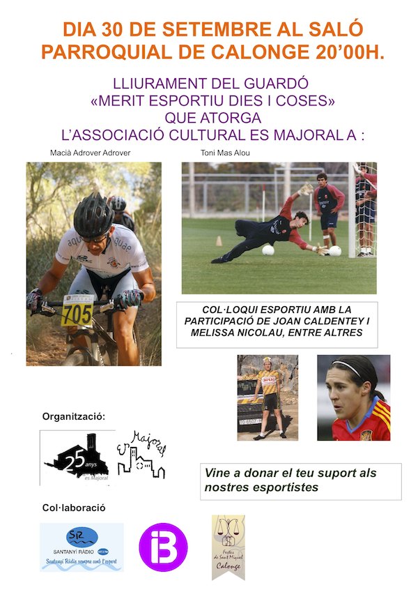 130930_merit-esportiuToni Campos, portero del Campos de la Tercera División balear de fútbol, y el ciclista Macià Adrover recibirán el premio «Mèrit Esportiu» de la revista «Dies i Coses», que recibirán el próximo 30 de septiembre en un acto que tendrá lugar con motivo de las fiestas de Sant Miquel de Calonge (Santanyí) y que se realizará en el salón parroquial de la localidad a las 20:00 horas.