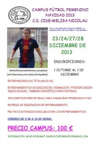 La mejor jugadora de futbol que mallorca a dado Melisa Nicolau ex Jugadora del FC BARCELONA y tambien de nuestro querido club nos ofrece un campus de navidad 2013 para femeninas, de todas las edades, la verdad que es una buena oportunidad para las chicas de las islas que una jugadora internacional y que lo ha ganado todo pueda realizar este campus. No lo dudeis que seguro que es un exito…..