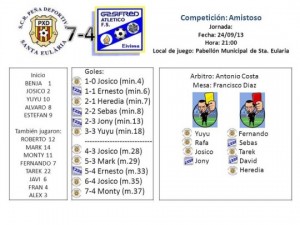 27 septiembre 2013 | Por lorenzo | Categoria: Fútbol SalaEl VFS Peña Deportiva vence 7-4 al Gasifred Atletico, en un partido con mucha intensidad y que se ha saldado con varias expulsiones. En lo deportivo, el equipo ha estado mas acertado que su rival en momentos claves del encuentro y ha sido justo vencedor del partido. El resultado es engañoso ya que en muchos momentos del encuentro ha estado muy igualado. Los nuestros cogen rodaje y siguen con su puesta a punto para la competicion, que arrancará el próximo 5 de octubre contra este mismo rival.