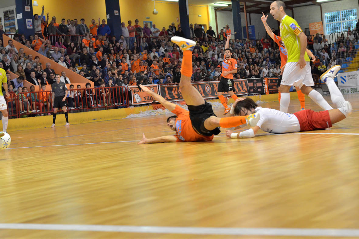 Los jugadores de Tomás de Dios iniciaron el partido con una gran presión sobre el rival con el claro objetivo de incomodar a Burela que buscaba su primera victoria como local. Es la carta de presentación de los mallorquines en cada partido y más cuando juegan lejos de Mallorca. Los gallegos son uno de los equipos que mejor se han reforzado este verano y cuentan con una plantilla de mucha calidad por lo que el Hospital de Llevant no quería dejar ni un solo espacio al rival. Gran inicio de los Baleares que volvieron a mostrar que son un equipo muy fuerte defensivamente y que ejerce una presión asfixiante al rival lo que les convierte en un equipo difícil. Burela tuvo varias oportunidades para adelantarse en el marcador pero se toparon con Carlos Barrón que fue uno de los mejores del partido en su primer encuentro completo con el cuadro mallorquín. A los 9 minutos de partido, Taffy marcó el primer tanto para el Hospital de Llevant Manacor FS culminando una buena jugada de ataque. El brasileño lleva ya cuatro goles esta temporada y es uno de los jugadores más en forma. Los locales acusaron el gol y cedieron el protagonismo al Hospital de Llevant que gozó de varios minutos de superioridad en la pista y con ocasiones para ampliar la distancia que no se concretaron debido a la de acierto en algunos casos y en otros porque álex también ofreció una buena actuación en la meta gallega. Vega tuvo una ocasión muy clara para marcar el segundo pero falló tras hacer lo más complicado y errar en lo más fácil. El que sí acertó, y de forma magistral, fue Joselito que anotó el segundo tras un gran contragolpe de los manacorines que culminó el andaluz con una magnífica vaselina. Apenas un minuto después, en el 18, los colegiados señalaron un penalti para Burela por manos de Chicho dentro del área que significó el primero para los locales al transformar Matamoros.