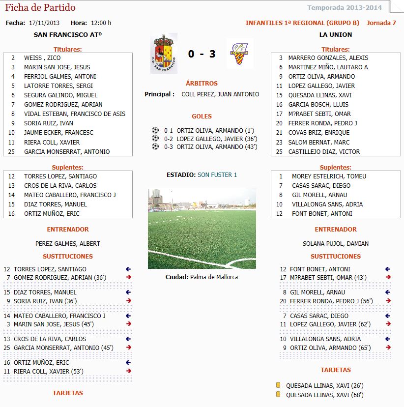 18 noviembre 2013 | Por lorenzo | Categoria: Fútbol Regional Partido pasado por agua y en el cual apenas se podÃa jugar debido a la gran cantidad de agua que caia y que el césped no le daba tiempo a absorber. Afortunadamente la Unión marco en el Primer minuto de partido y tambien en el Primero de la segunda parte cosa que no dejo reaccionar al equipo local , La Unión estuvo muy bien posicionado siendo superior en todo momento y tan solo los cambios del San Francisco inquietarón algo. D.S.