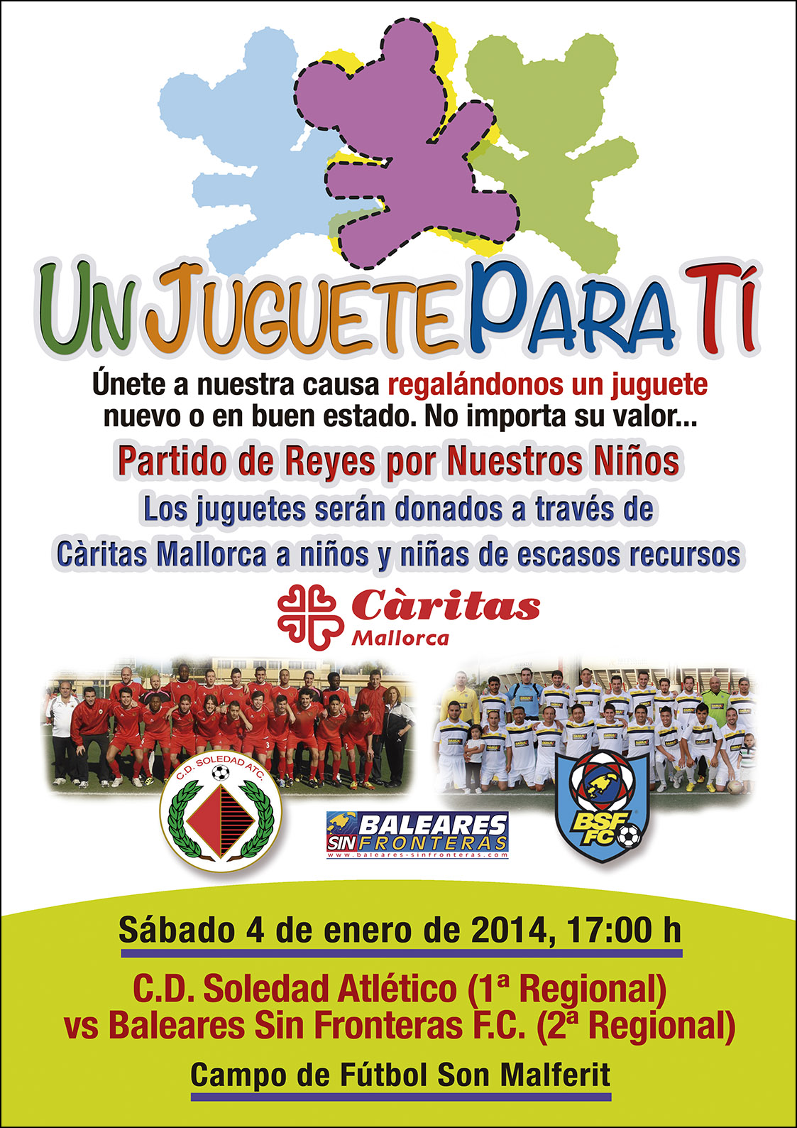 Dos clubes muy humildes, con pocos o nulos recursos, pero llenos de humanidad, como son el C.D. SOLEDAD ATC. y BALEARES SIN FRONTERAS C.F., se unen para una causa muy solidaria, recoger juguetes para los niños más necesitados, juguetes que serán entregados a Cáritas para que sea la encargada de repartirlos entre esos niños, para ello organizan un partido de fútbol el próximo sábado dÃa 4 de Enero a las 17:00 horas en el campo de Son Malferit (campo de la Federación en la Soledad), con el fin de que toda persona asistente sea portadora de un juguete, nuevo o usado pero en buen estado a fin de recoger cuantos más mejor. Esperamos que la asistencia de público sea muy, muy numerosa para poder hacer felices al mayor número de niños posible. NO PODEIS FALTAR, LA SONRISA DE UN NIÑO NO TIENE PRECIO. OS ESPERAMOS A TODOS. Si quereis colaborar, aún en el caso de no poder asistir al partido, podeis aportar vuestros juguetes en las oficinas del club situadas en el mismo campo de Son Malferit, lunes dÃa 30 de Diciembre, Jueves dÃa 2 y viernes dia 3 de Enero, de las 18 a las 20:30 horas. NO FALLEIS, COLABORAD. MUCHAS GRACIAS EN NOMBRE DE TODOS LOS NIÑOS PODRAN ESBOZAR ESA SONRISA GRACIAS A TODOS VOSOTROS.