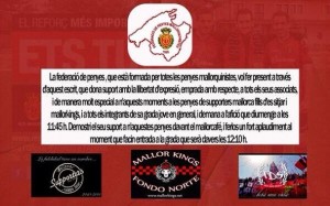 Chapeau a la Federació de Penyes que preside Miquel Mesquida, que acaba de publicar un comunicado pidiendo apoyo para los peñistas maltratados por Cerdà , a los que se privó de expresarse libremente durante el último partido en Palma. Esta sà es una Federación de Penyes que trabaja para los peñistas, y no la grotesca directiva anterior, con Rafael Martorell, Pello Amengual y Pep Roig, que se dedicaban a felicitar al Atlético Baleares a través de la web oficial de las peñas.