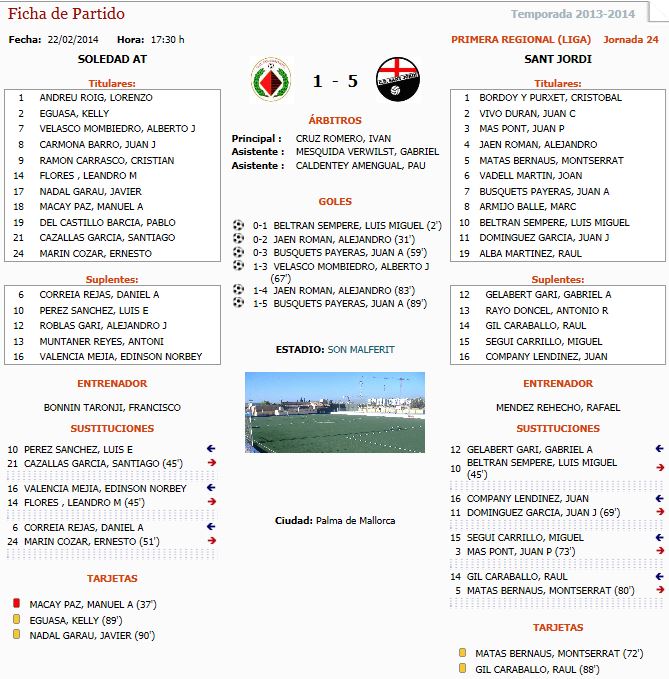 A destacar, por el Sant Jordi todo su conjunto sin desmerecer a nadie, por el Soledad, el golazo de Alberto que parecÃa que enchufarÃa al resto de sus compañeros, pero que no ha sido asà ya que solo ha sido un espejismo, el penalti detenido por Sito el portero del Soledad frente al máximo goleador de la categorÃa, al buen, aunque amargo debut de Pablo y el bregar de dos grandes jugadores pero que no han tenido acompañamiento, Cristián y Carmona, por lo demás lo comentado, el Soledad un equipo muy conformista, falto de ambición y sobretodo muy poco luchador en la mayorÃa de sus jugadores, en definitiva un Soledad penoso, el resultado final lo dice todo 1 a 5.