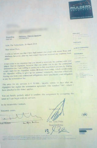 Ha llegado a mi conocimiento que usted tiene interés en rescindir el contrato con su jugador Marvin Ogunjimi, asà como que usted prefiere no pagar el año que le queda de contrato. Estoy dispuesto a asesorarle en esta negociación buscando un nuevo equipo para el Señor Ogunjimi en menos de 48 horas desde hoy, lo que harÃa que el Señor Ogunjimi se mostrarÃa dispuesto a romper su contrato voluntariamente, liberándoles de sus obligaciones contractuales ; más especÃficamente, de su obligación de pagar el año que le queda de contrato. El precio por mis servicios es de 30.000 euros, abonables en menos de catorce dÃas desde que Ogunjimi hubiera firmado la rescisión de su contrato. Por la presente le solicito que confirme el acuerdo firmando esta carta para poder empezar con mis servicios.(Diariodemallorca.es)
