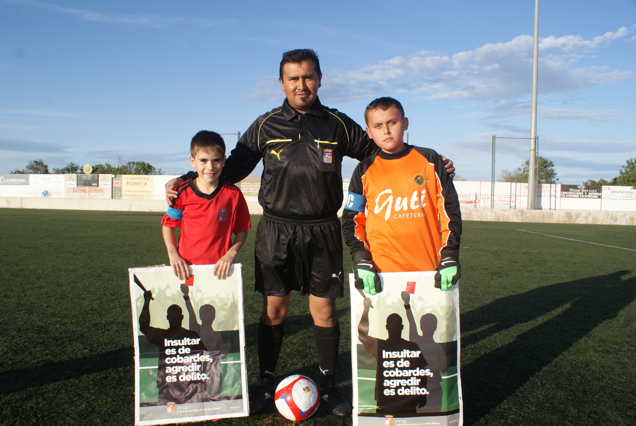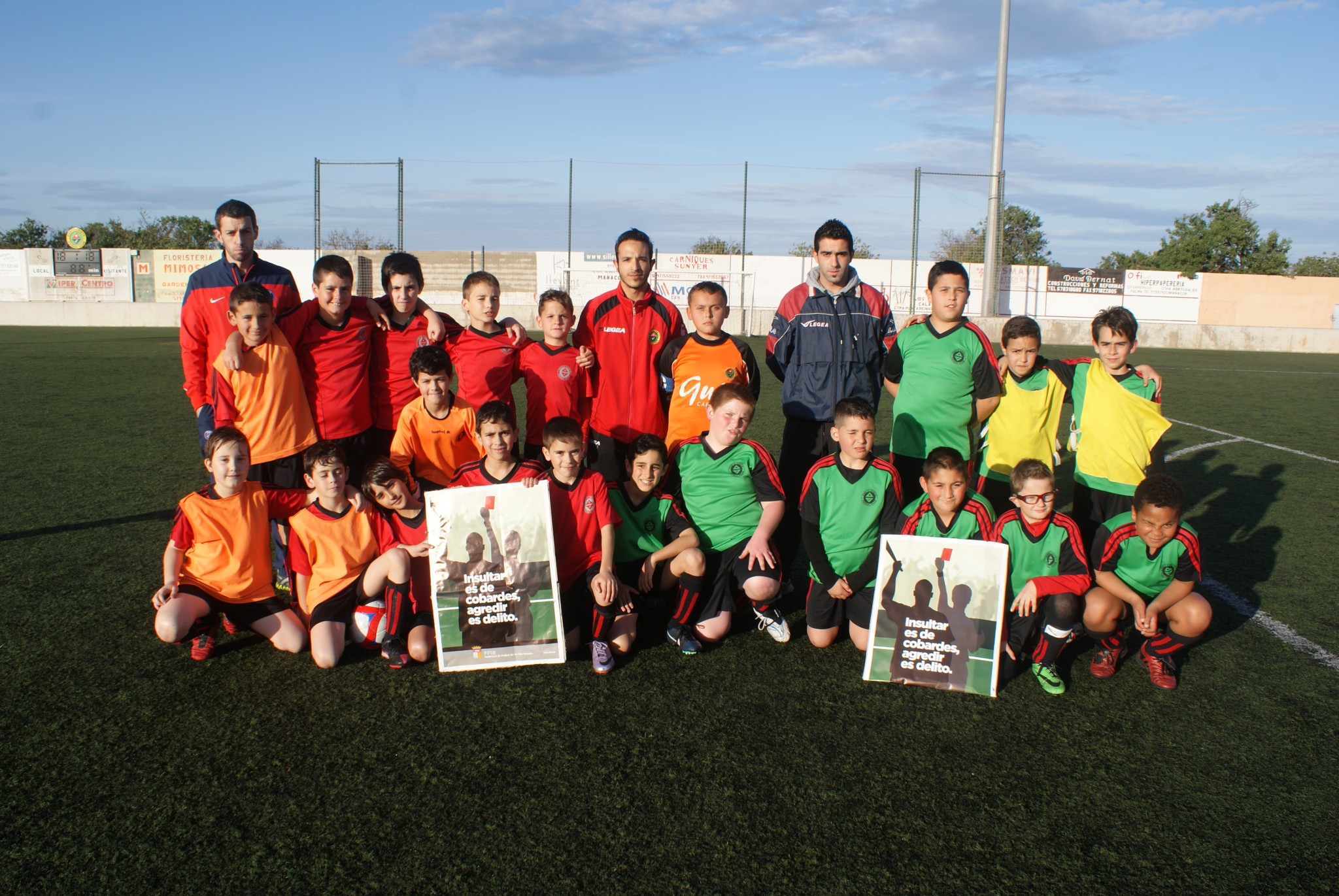 Aprofitant que avui jugaven dos dels  benjamins un contra l’altre els dos equips han sortit al camp i posteriorment els capitans s’han fotografiat amb l’àrbitre lluint dos cartells amb el lema de la campanya “Insultar es de cobardes, agredir es delito”. Esperem que aquesta campanya sorgeixi efecte i sumant un a un els granets d’arena que cada club pot aportar, poc a cop es vagin eliminant aquest tipus de comportament en els terrenys de joc.