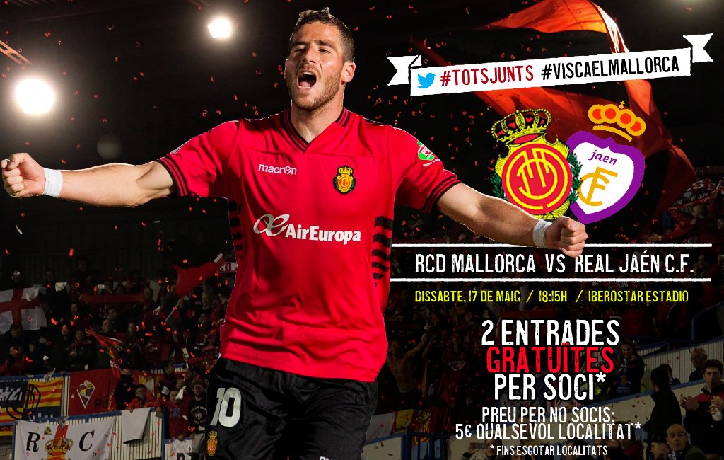 El RCD Mallorca pone a disposición de los socios bermellones entradas gratuitas para presenciar el próximo partido frente al Real Jaén, que se disputará el sábado 17 de mayo a las 18:15h en el Iberostar Estadio.