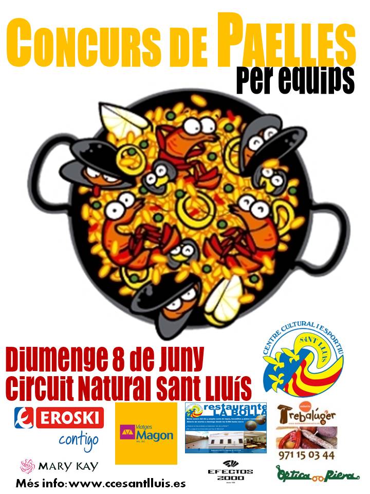 Marca el calendari el tram final de la temporada 2013-2014 i és per això que des del CCE Sant LluÃs fa setmanes que s’està treballant per preparar una festa de final de temporada diferent . Si l’any passat van ser les instal · lacions del Restaurant Las Dunas de Sant Tomà s les que van acollir als més de 200 participants de la Diada 100% CCE , aquest any és el Circuit Natural qui diumenge 8 juny donarà cabuda als equips participants en el Primer Concurs de Paelles organitzat per la nostra entitat .