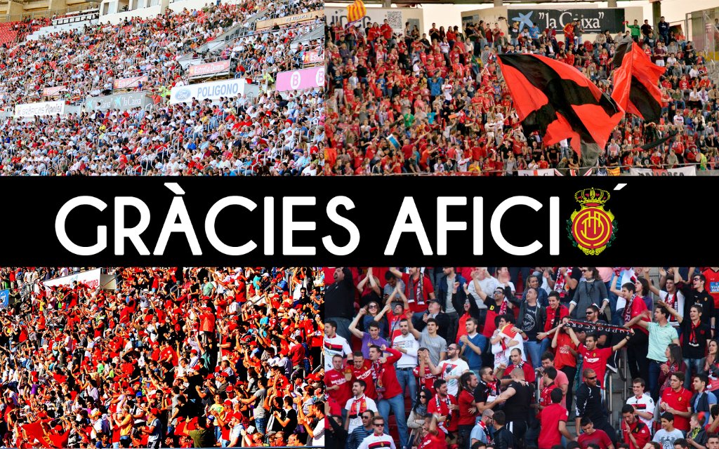 Tras el último encuentro de la temporada 2013-2014, el RCD Mallorca quiere agradecer a la afición bermellona el apoyo y compromiso que han mostrado al equipo durante la actual campaña. Por ello, es un orgullo y una satisfacción para el club contar una vez más con una afición de diez que no ha bajado los brazos a lo largo del campeonato, siendo fiel al conjunto en los momentos buenos y no tan buenos.