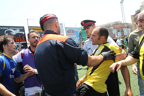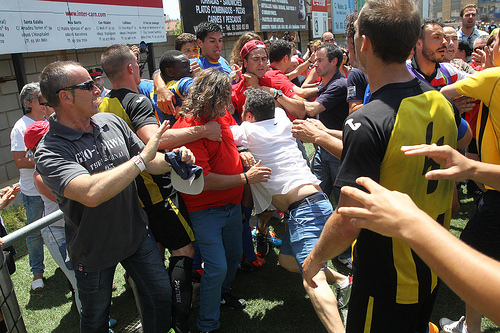 La eliminación no ha sentado nada bien en el estadio de Nou Barris, de la capital catalana, donde si no llega a ser por la intervención de la policÃa su hubiera producido el linchamiento del equipo visitante. Cuando el entrenador del Formentera, Luis Elcacho, estaba siendo felicitado por su hija sobre el terreno de juego, este ha recibido varios puñetazos por la espalda. Los jugadores del equipo de casa no han ayudado a contener los ánimos de los aficionados y en algunos casos han alimentado su comportamiento interviniendo también en alguna de las cargas que se han producido sobre los futbolistas de la menor de las Pitiüses.