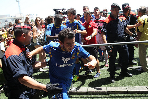 Los Mossos d’Esquadra han tenido que proteger a los jugadores y a algunos aficionados del Formentera al término del ecunuentro en el campo de la Montañesa, donde la afición local ha provocado graves incidentes y ha agredido a jugadores y cuerpo técnico del conjunto visitante, que ha superado la eliminatoria de ascenso a Segunda División B a pesar de haber perdido por 3-1 gracias a la renta del partido de ida, 2 a 0.