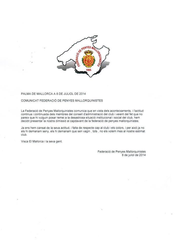 En un comunicado la actual Junta de la Federación de Peñas del Real Mallorca ha presentado su dimision cansados por su falta de respeto al club y su actitud exigiendo que se marchen todos de una vez.