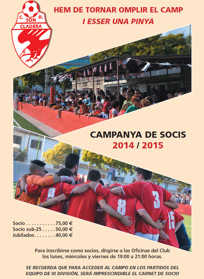 Acompañamos cartel Campaña de Socios Temporada 2.014 / 2.015 bajo el lema “HEM DE TORNAR A OMPLIR EL CAMP I ESSER UNA PINYA”, queriendo demostrar que hemos de ir juntos de la mano afición y equipo en esta difícil singladura que vamos a empezar el próximo 23/24 de Agosto, fecha histórica donde se jugará el primer partido del Campeonato, ya se sabrá el rival al realizarse el sorteo del calendario en la mañana del sábado.