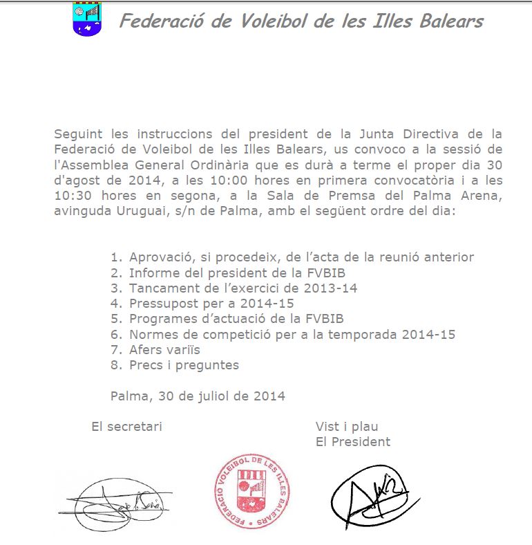 Convocatoria Asamblea de la FederacÃon Balear de Voleybol