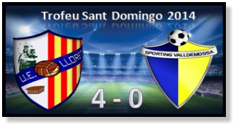 DSC_0273 (Copiar)Amb moltissima calor es va presentar ahir la plantilla de la UE.Lloret. La presentació la va dur a terme la nostra “speaker oficial” Andrea, que va presentar un a un tots els membres de la plantilla per la propera temporada. Després de les paraules del batle de la localitat D. Juan Jaume i del nostre President D. Miquel A.Coll donar inici el partit corresponent al “Trofeu Sant Domingo 2014″ que el nostre equip disputava contra el Sp.Valldemossa. Molt aviat la superioritat local va tenir la seva recompensa ja que en el minut 2 Alex inaugurava el marcador. El Lloret es va fer amo i senyor del partit, ben assentat darrere amb un centre del camp que disputava i jugava totes les pilotes i una davantera molt encertada, aviat van anar caient els gols. Així, abans del descans Ramón i més tard Juanito van posar el 3-0 amb què va finalitzar la primera meitat.