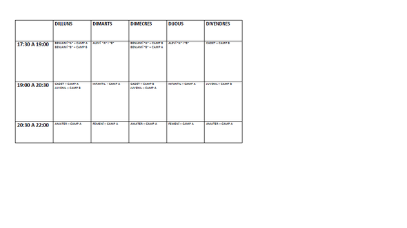 bunyolaAquí teniu els que seran els horaris d’entrenament dels diferents equips aquesta temporada: