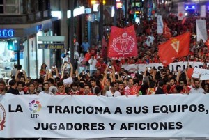 manifestacion-murcia-futbol-644x362-300x201Sigue enquistándose el “Caso Murcia”, si ayer los rumores apuntaban a una liga de 24 equipos, que supondría el ascenso del Real Madrid Castilla, hoy se apunta que la Real Federación Española de Fútbol no accederá a una liga que no sea de 22 equipos. Más leña a la hoguera en que se ha convertido el fútbol español.