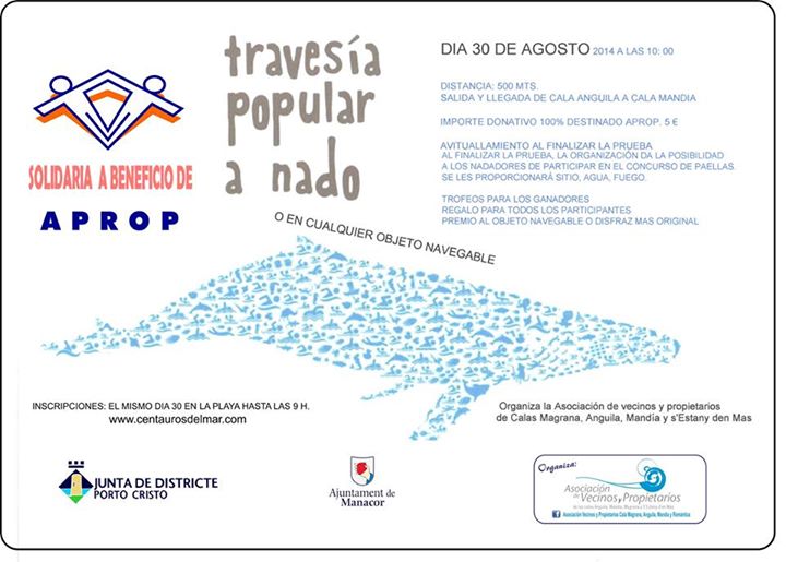 Como evento deportivo de las fiestas se organizará una travesÃa popular a nado solidaria, entre las playas de Cala Anguila y Cala MandÃa, a beneficio de la organización APROP (lucha contra el cancer).