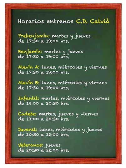 Aquà tenéis los horarios de los entrenos para esta temporada… Los juveniles, cadetes e infantiles ya entrenan. Si quieres probar, ven a un entreno, seguro que repites!