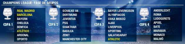 Este jueves tendrá lugar el sorteo de la fase de grupos de la Champions League 2014-15 (17:45 horas), con Real Madrid, Atlético y Barça como cabezas de serie y el Athletic en el bombo 3. A evitar, el Liverpool y la Roma.