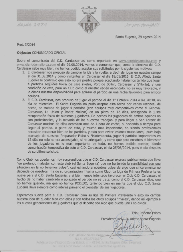 omunicado Oficial del club Santa Eugenia sobre lo publicado en el periódico Diario de Mallorca Y en Sportsdecanostra
