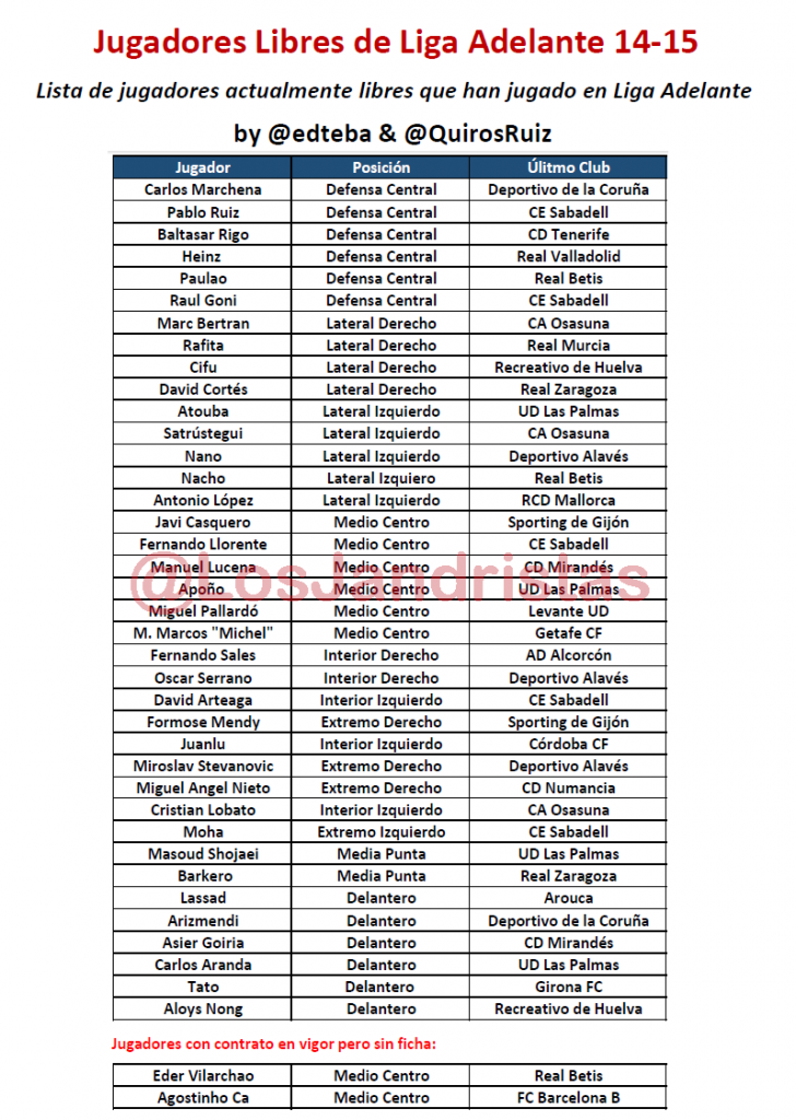 untitledLa relación de parados en Primera División la conocemos todos (Víctor Valdés, Jonas y Pedro León son las piezas más codiciadas), pero quizás la de Segunda os resulte algo más curiosa. Como podéis ver hay bastantes ilustres, y entre ellos tres ex-mallorquinistas como David Cortés, Antonio López o Javier Arizmendi.