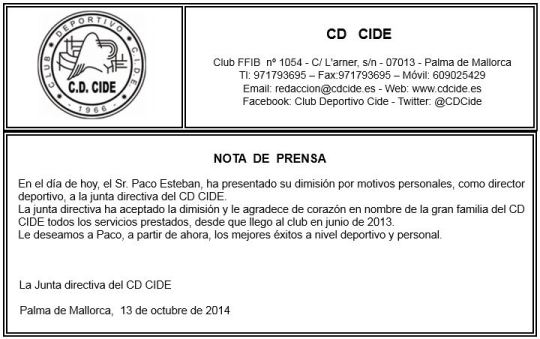 Según ha publicado la web del club Estudiantil Paco Esteban ha presentado en la mañana de este Martes su dimisión como Director Deportivo por motivos personales. Paco accedió al cargo en Junio de 2013.El club la ha aceptado y le desea muchos éxitos a nivel deportivo y personal