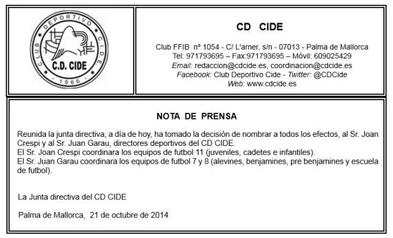 El Cide comunica que a todos los efectos que a partir del 21 de octubre nombra a todos los efectos Coordinadores del Club a Joan Crespi y Joan Garau