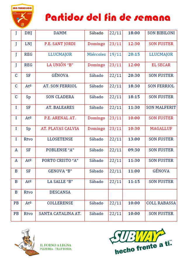 san franciscoEstos son los horarios de los diferentes equipos del club previstos para este proxímo fin de semana